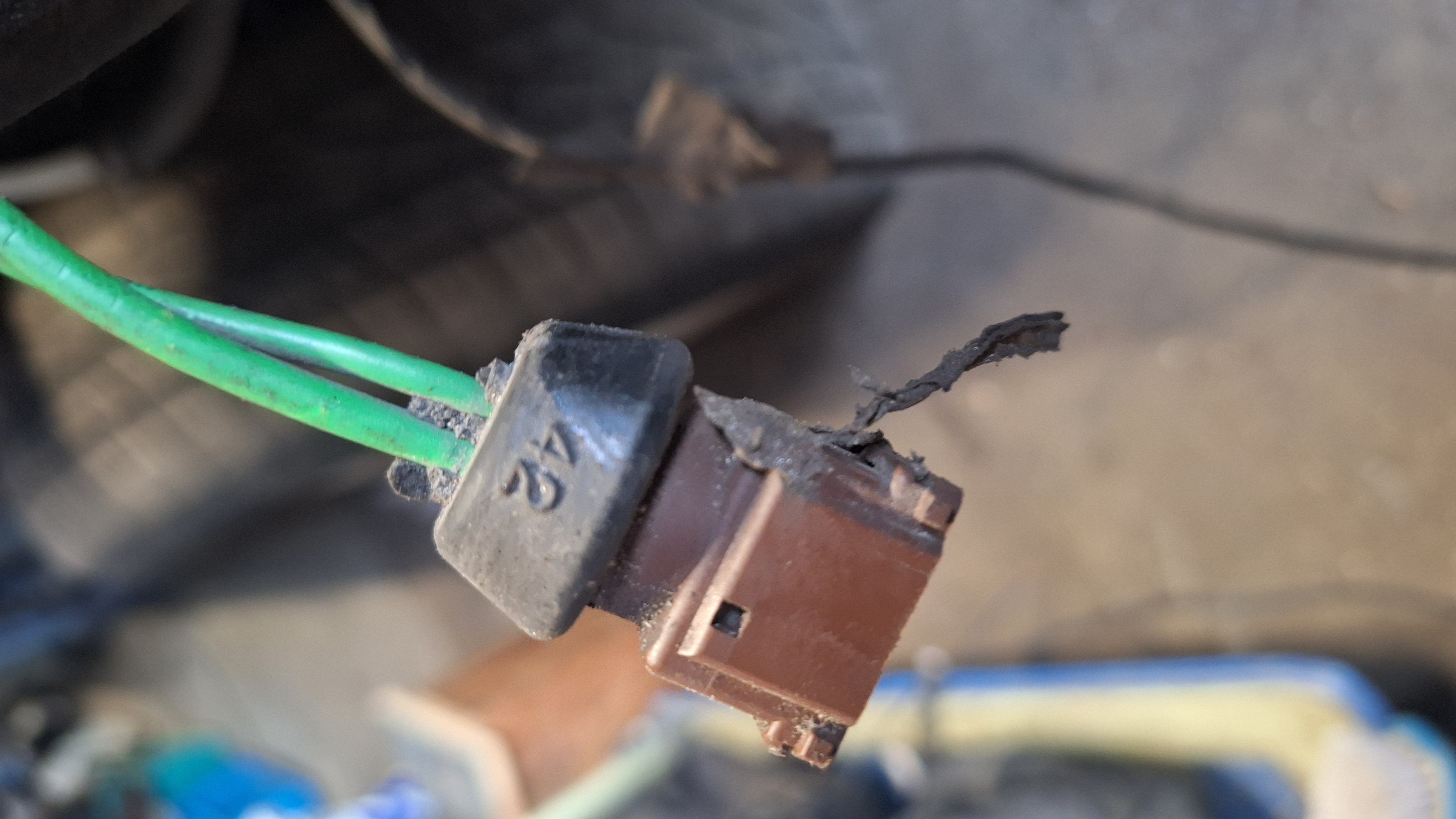 Van die 3polige moet je een duidelijkere locatie geven. Daar zijn er meerdere van bij het front. (En ik lig in bed, dus ik ga niet even onder de motorkap op zoek naar waar die kleurcombi van draden te vinden valt. x) )