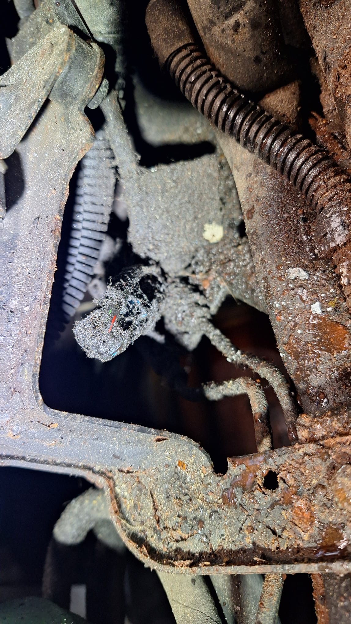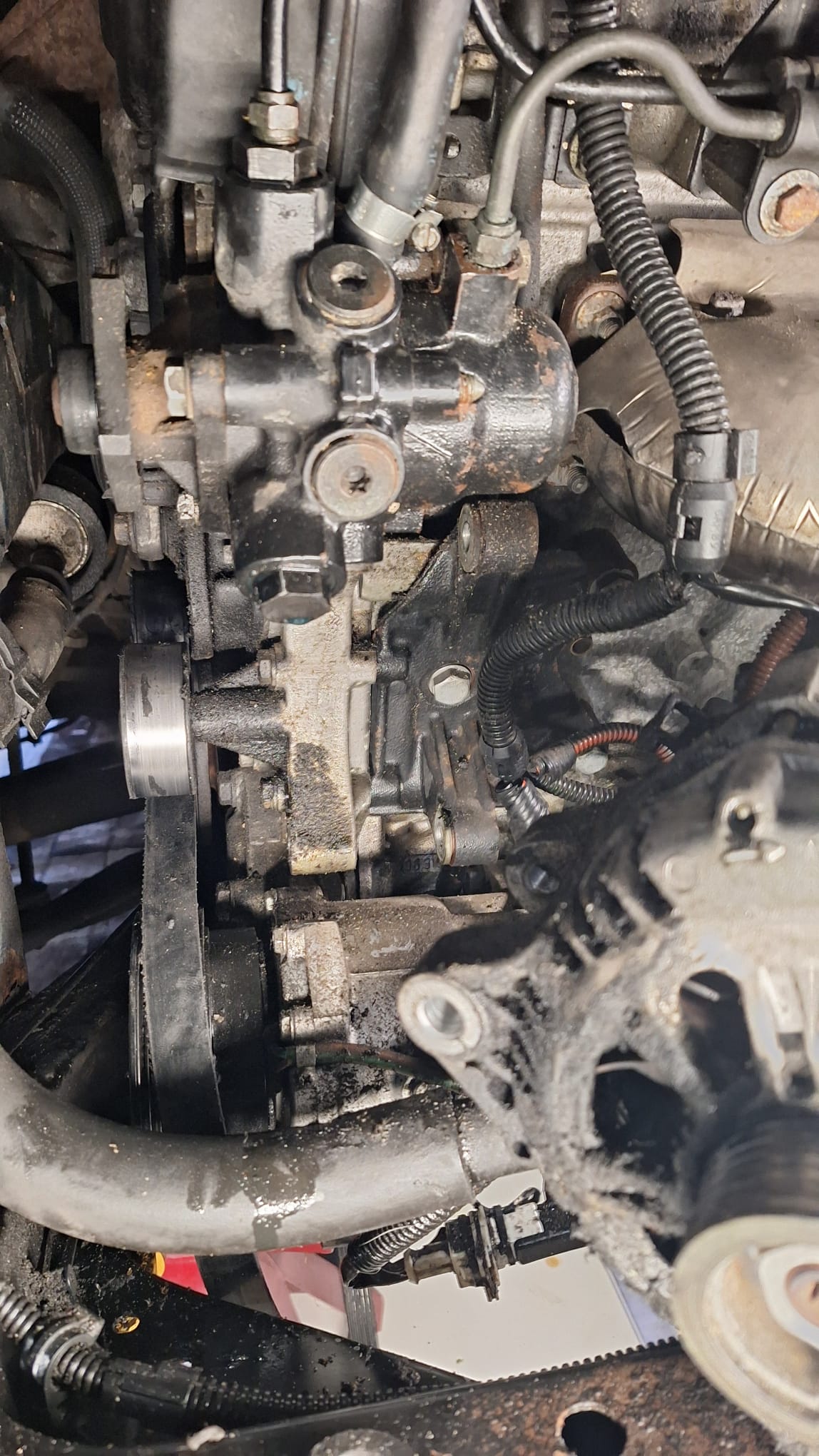 Zoja.., voel eens langs de binnenrand van het subframe naar voren toe. Over die rand loopt namelijk de LHM omlaag die ter hoogte van de pulleyzijde-afdichting omlaag lekt. (Ook deels die zijdes van de pomp en AC-pomp. Daarvan hangt de buitenpunt dus net boven die rand. Vandaar dat het dan niet onder de pompen op de grond lekt.)