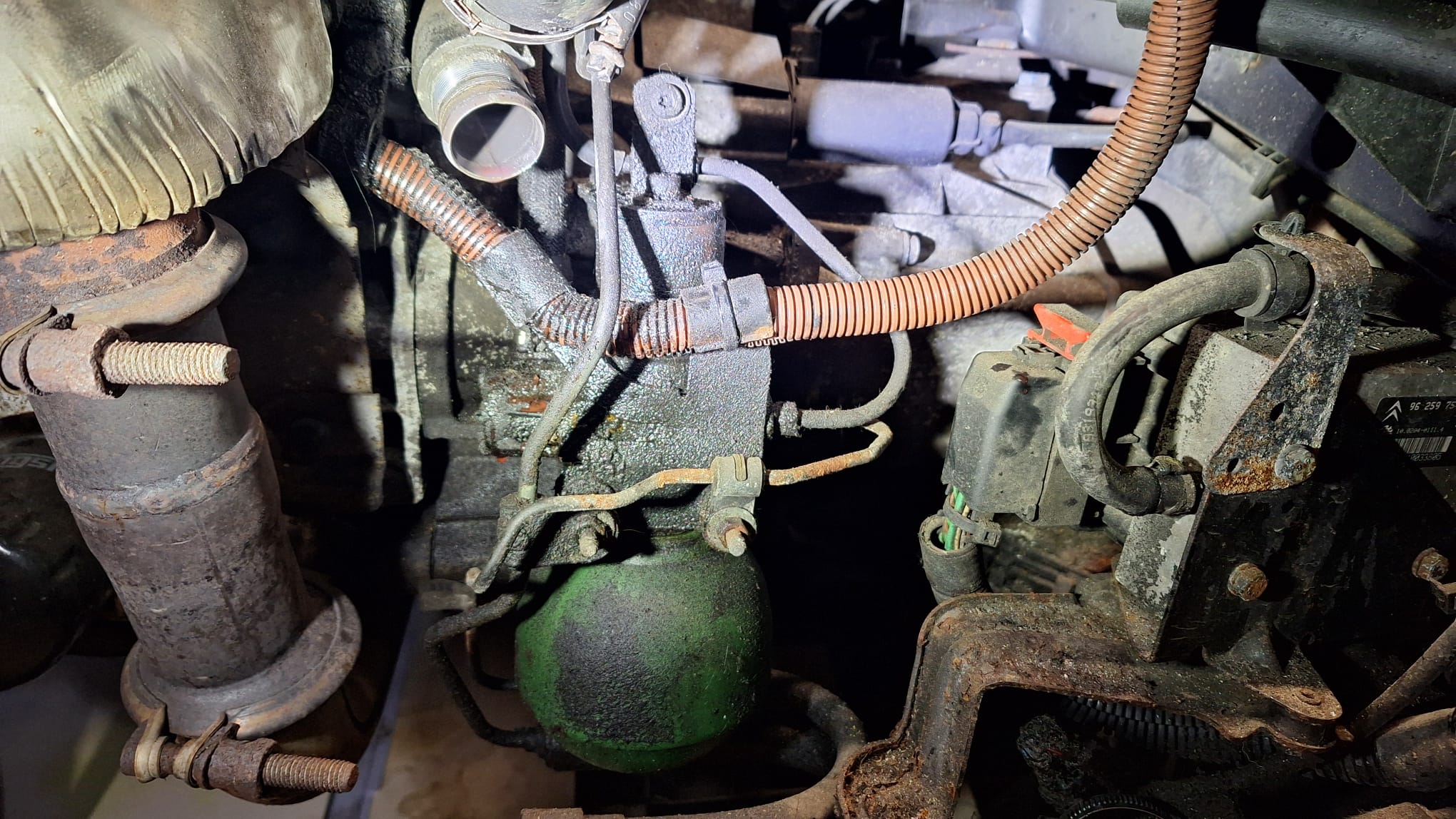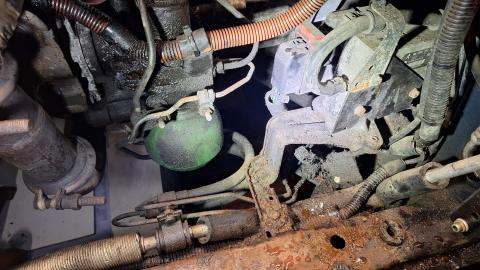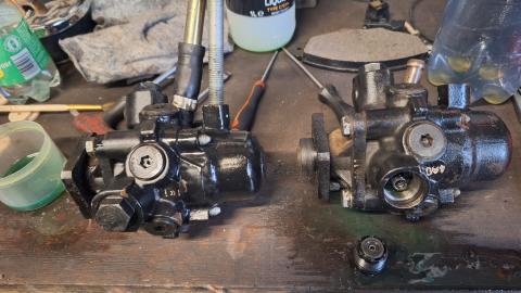 Als je plunjer afdichtingen lekken, of het koppelstuk van de aanzuigbuis, dan loopt de lekkage meestal meer over het middenvlak van de pomp en via de punt van de AC-pomp die wel vrij boevn de grond hangt. De LHM loopt dan ook meer langs de dynamo dan er in.