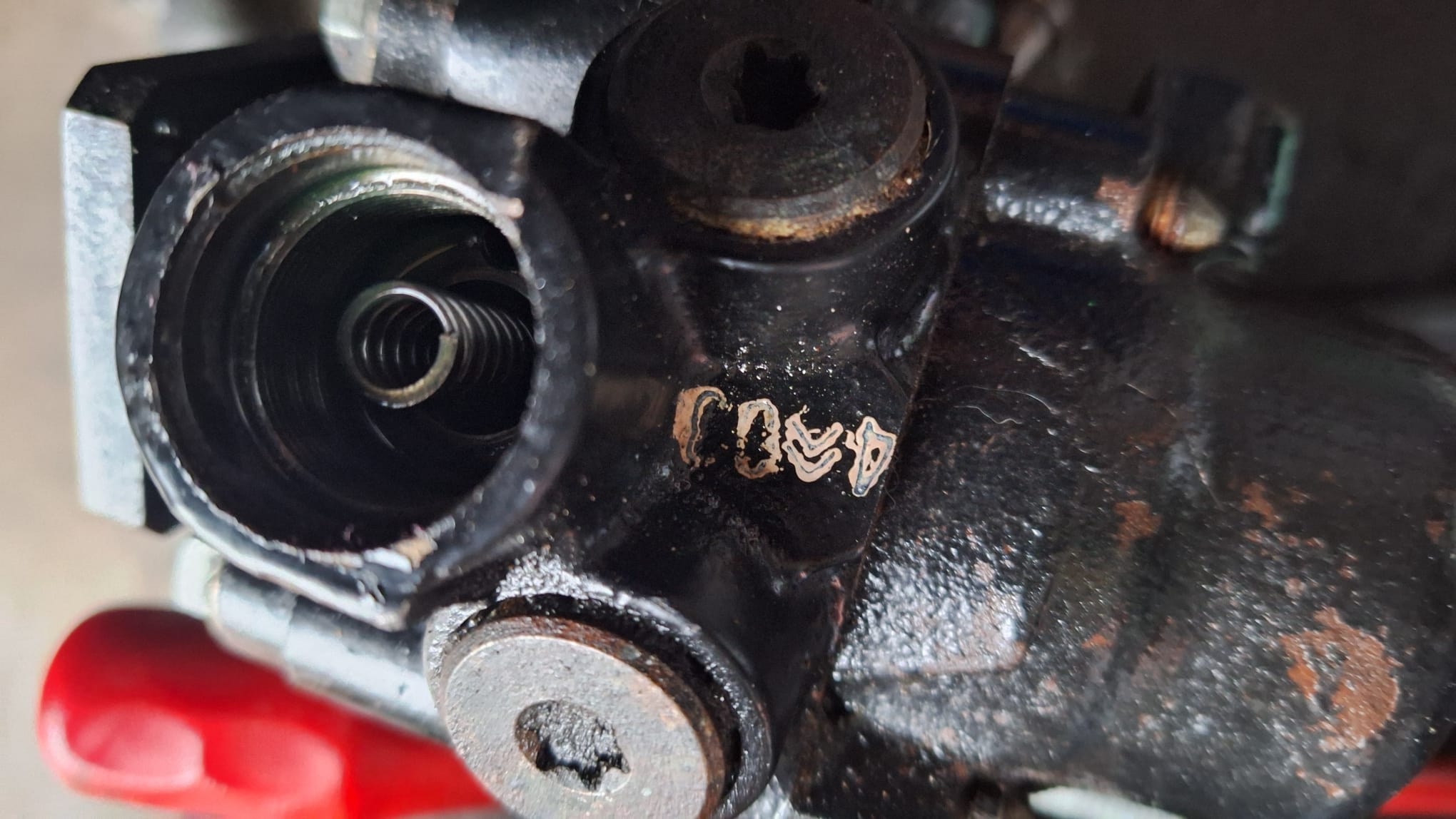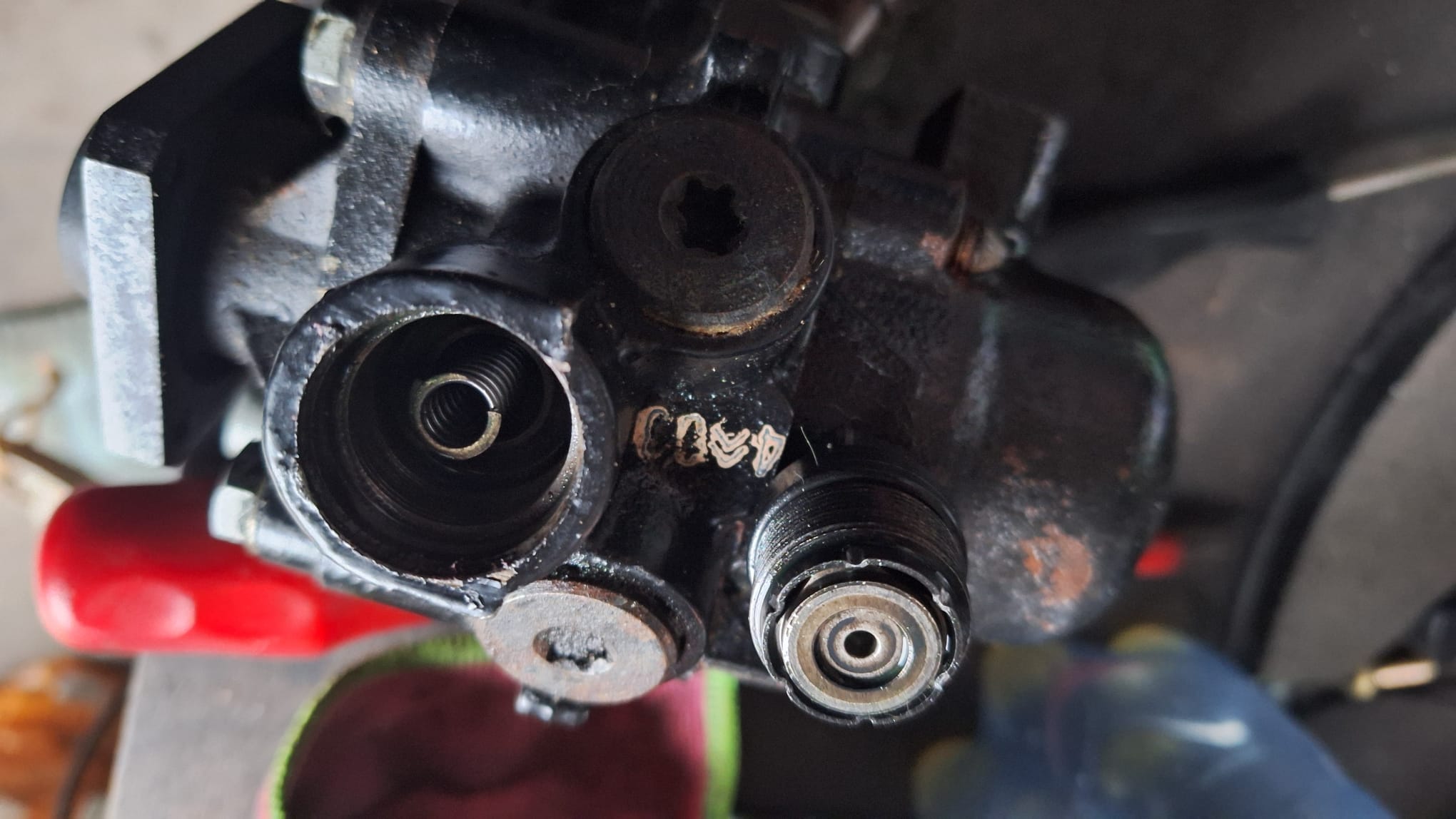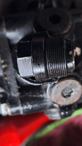 Die dop die je los hebt gehaald hebt, zit nog gewoon in elkaar zoals ie hoort. De veer met het cupje voor de kogel steekt nog in de plunjer die nnog gewoon in de pomp steekt.