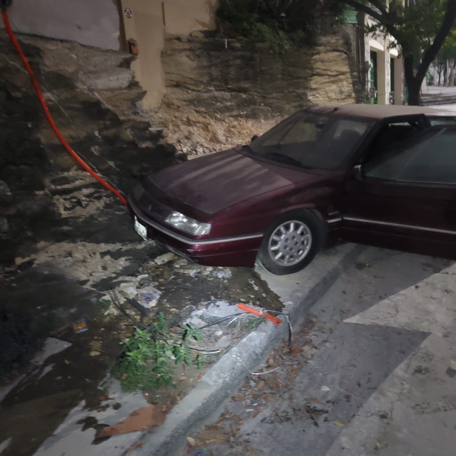 Met een arbeider die hier iets verder in een pick-up truck zat heb ik de auto weer terug op de straat getrokken. Het rechterwiel staat de verkeerde