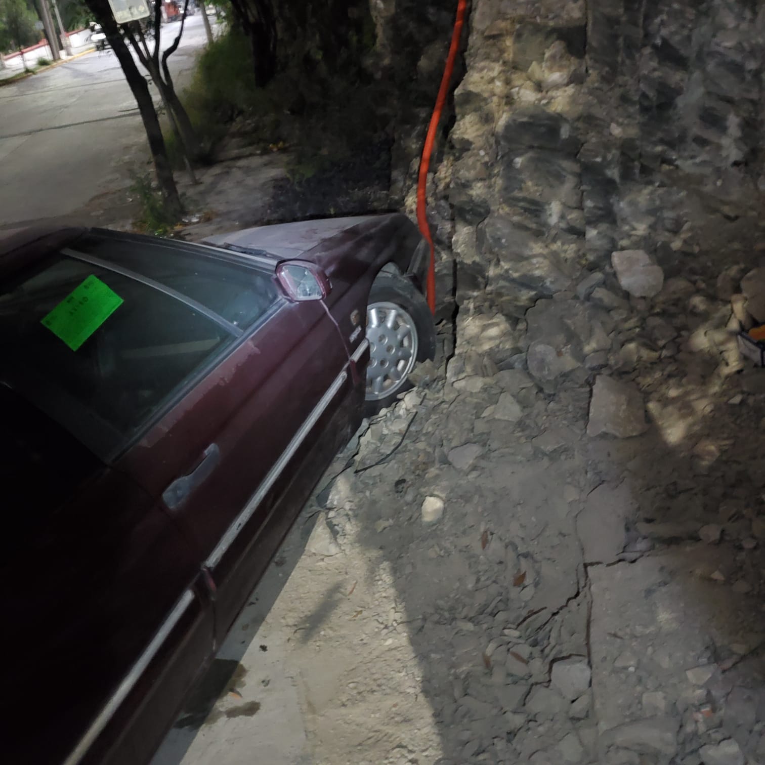 Dus nu staat hij aan de andere kant van de weg en ik denk dat het rechterwiel los is gekomen door de klap.