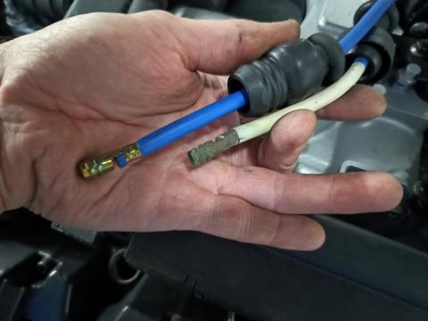 Beter kijkend valt ook op dat de geoxideerde kabel nog ouderwets een koperkern heeft. De andere vijf hebben een koolstofvezel als binnenkern.