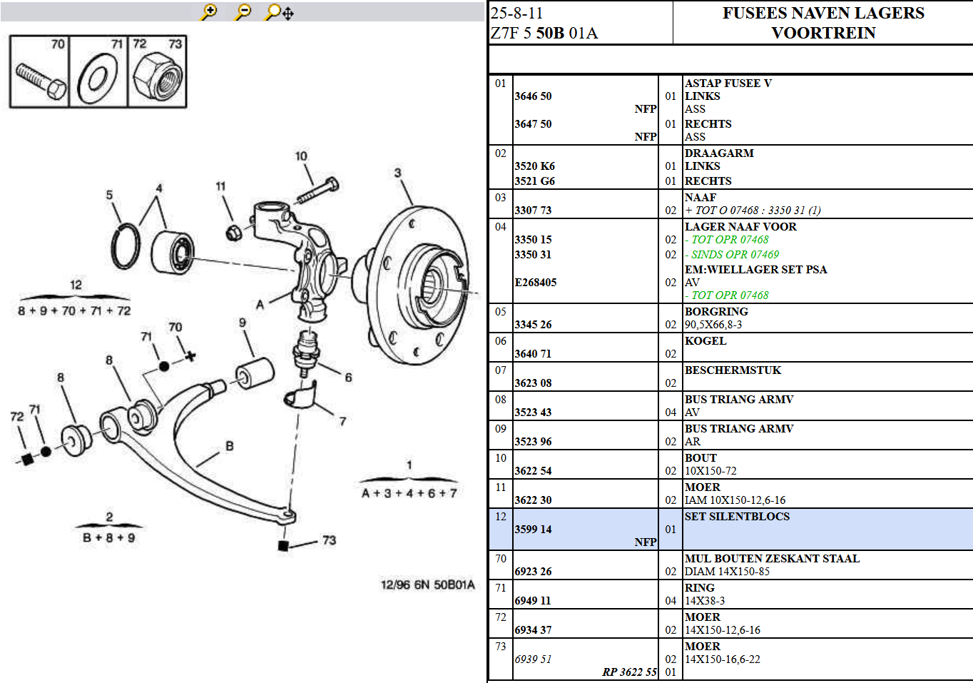 Het vervelende is dat ook de 605 en de 607 geen draagarmen hebben met die nummers. Voor een deel komen ze wel overeen met de XM, maar alleen bij een atmosferische 605 tweeliter van vóór de facelift. Peugeot gebruikte die draagarmen blijkbaar wel tot de facelift kwam. Hieronder voor de volledigheid de onderdelen van de 605 Z6 en Z7 en de 607 Z8: