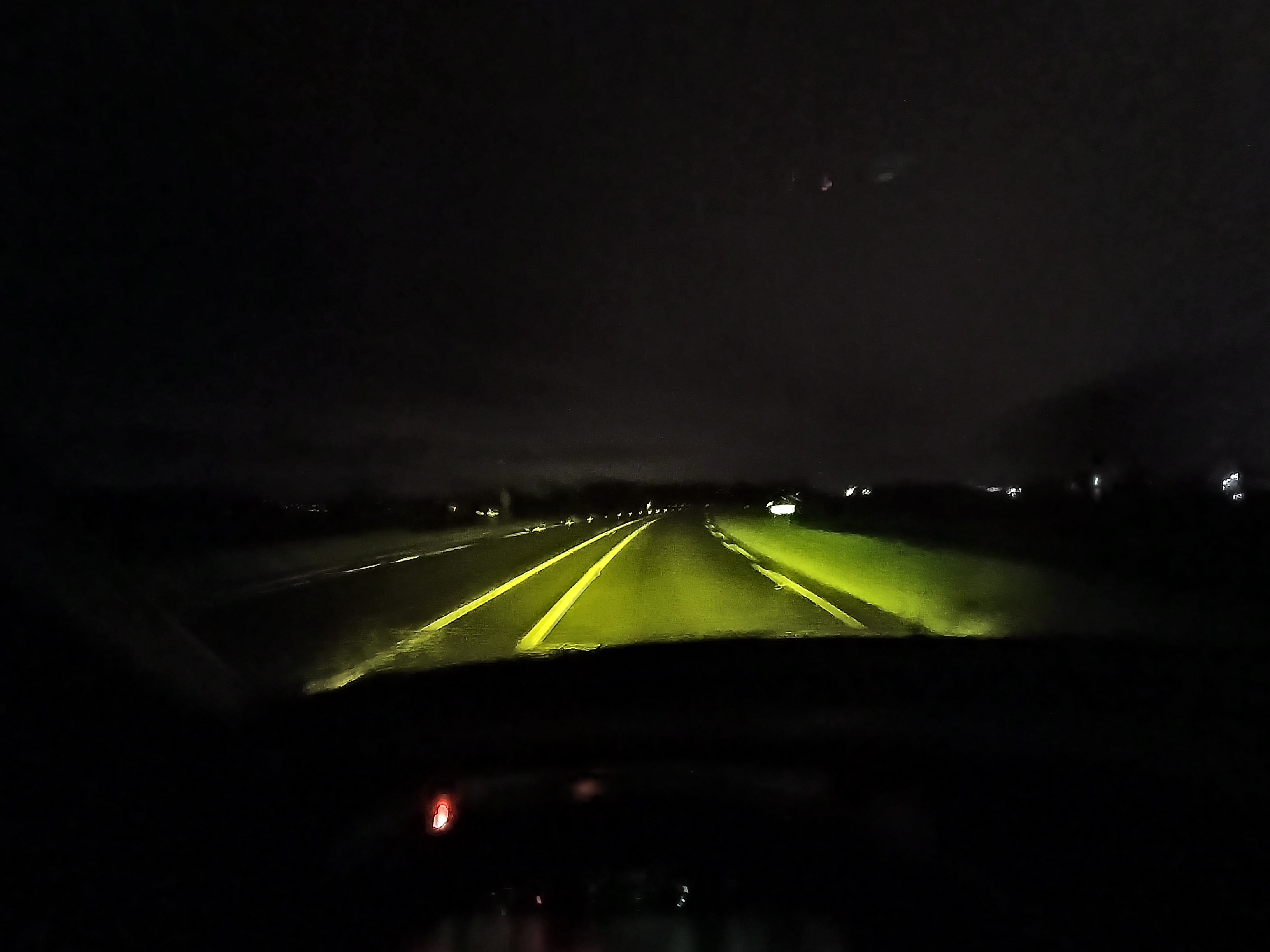 Nogmaals.., 's nachts hiermee door de polder denderen is echt een genot. Dimlicht verlicht de weg voor je nu bijna zodanig ver en helder als grootlicht ook zou doen. (logisch, het is eigenlijk grootlicht waar deels een plaatje voor geklapt zit.) Zet je grootlicht aan, dan wordt ook je horizon en zaken in de verte die hoger dan het wegdek liggen verlicht.