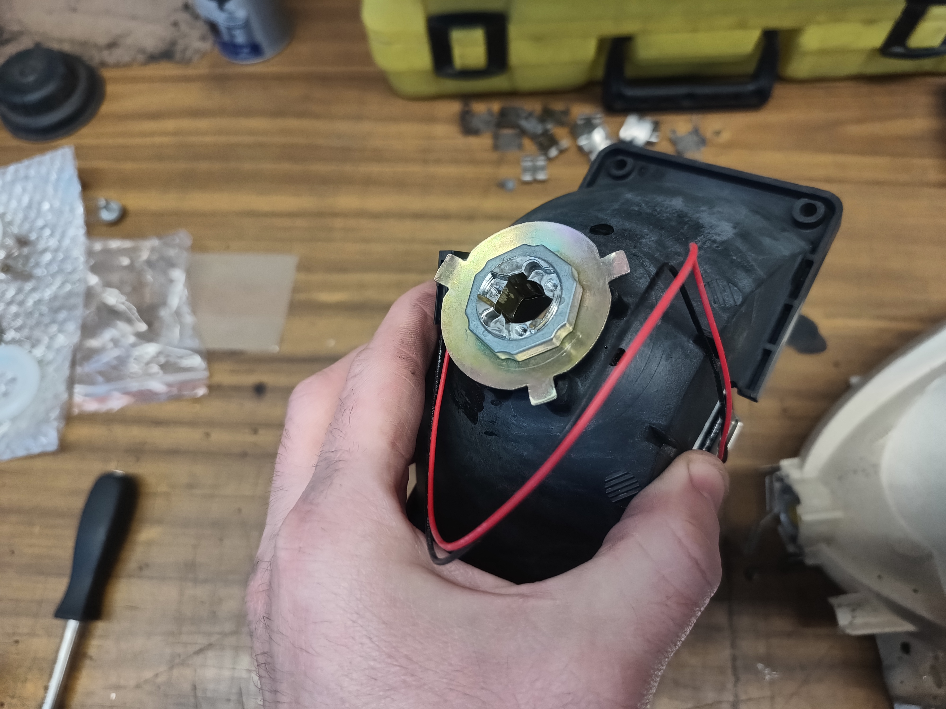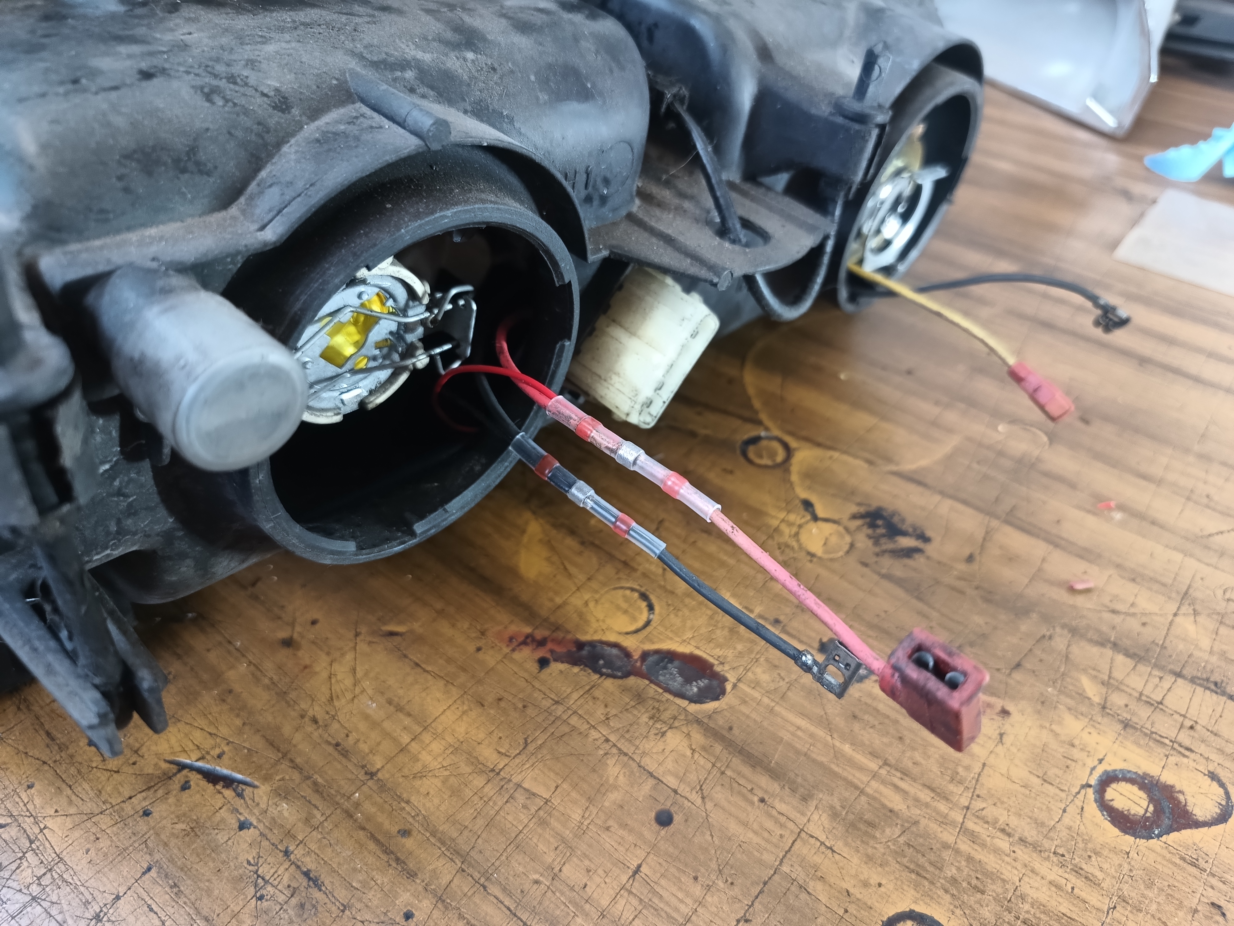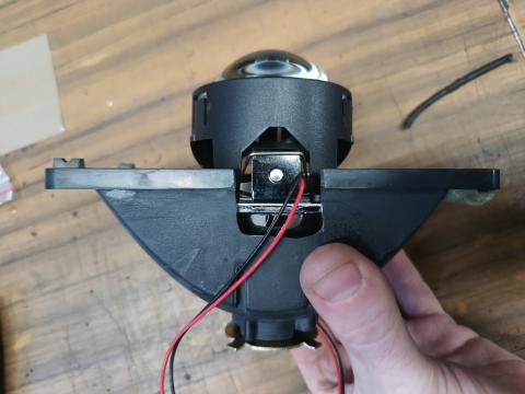 Draden van het solenoid verbinden we met de draden van het grootlicht in de behuizing.