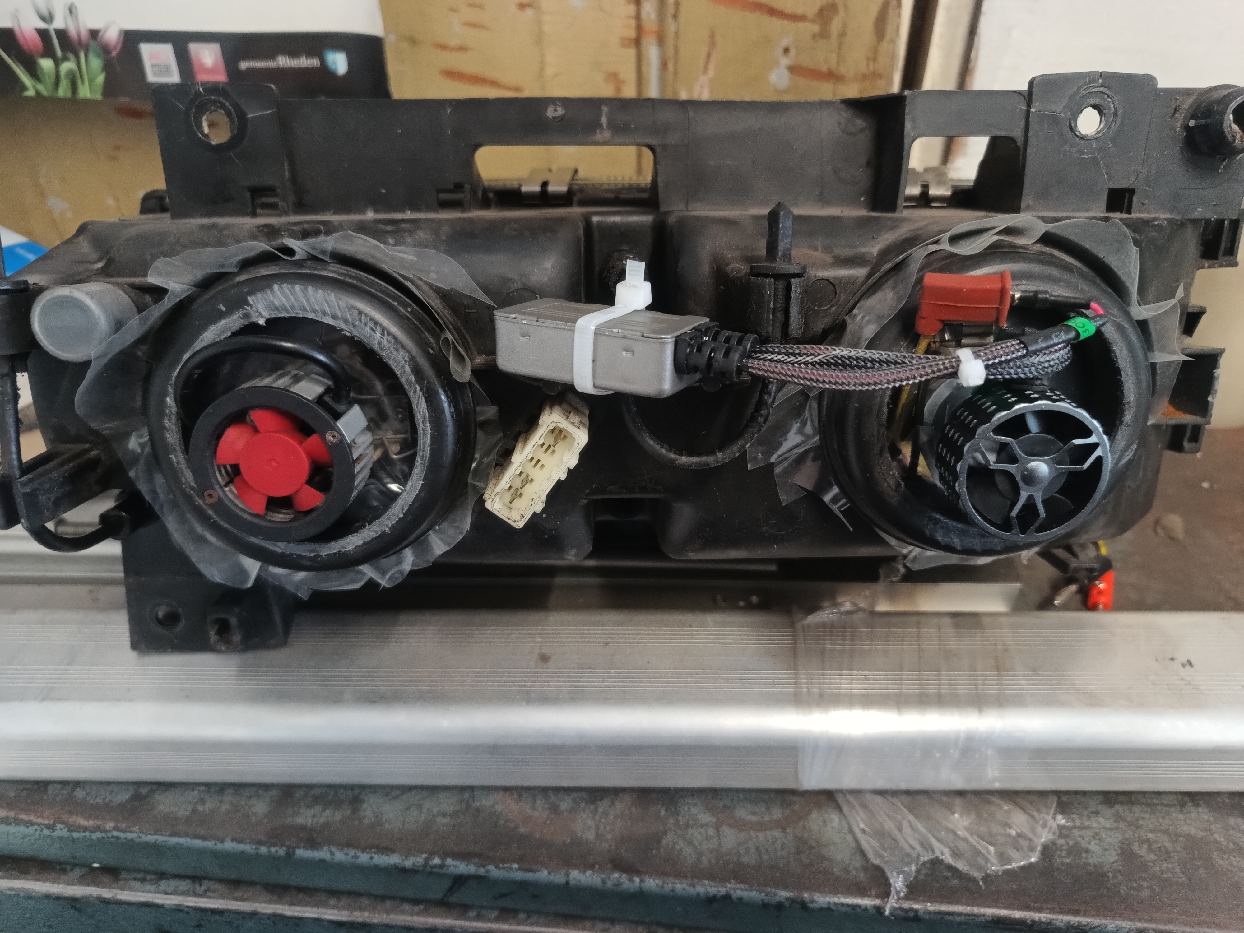 (Voorheen had ik de stofkappen weg gelaten. Bij het inbouwen van de projectors ben ik er dus achter gekomen dat die dingen er niet voor niets op zitten)