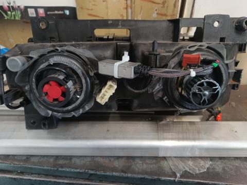 Dimlicht reflector kan je daar weer vanaf schroeven om aan te passen met de dremel en zaag. Niet te zien op de foto maar in de spiegel zitten boven en onder verhogingen die je vlak moet slijpen om de projector er in te kunnen schuiven.