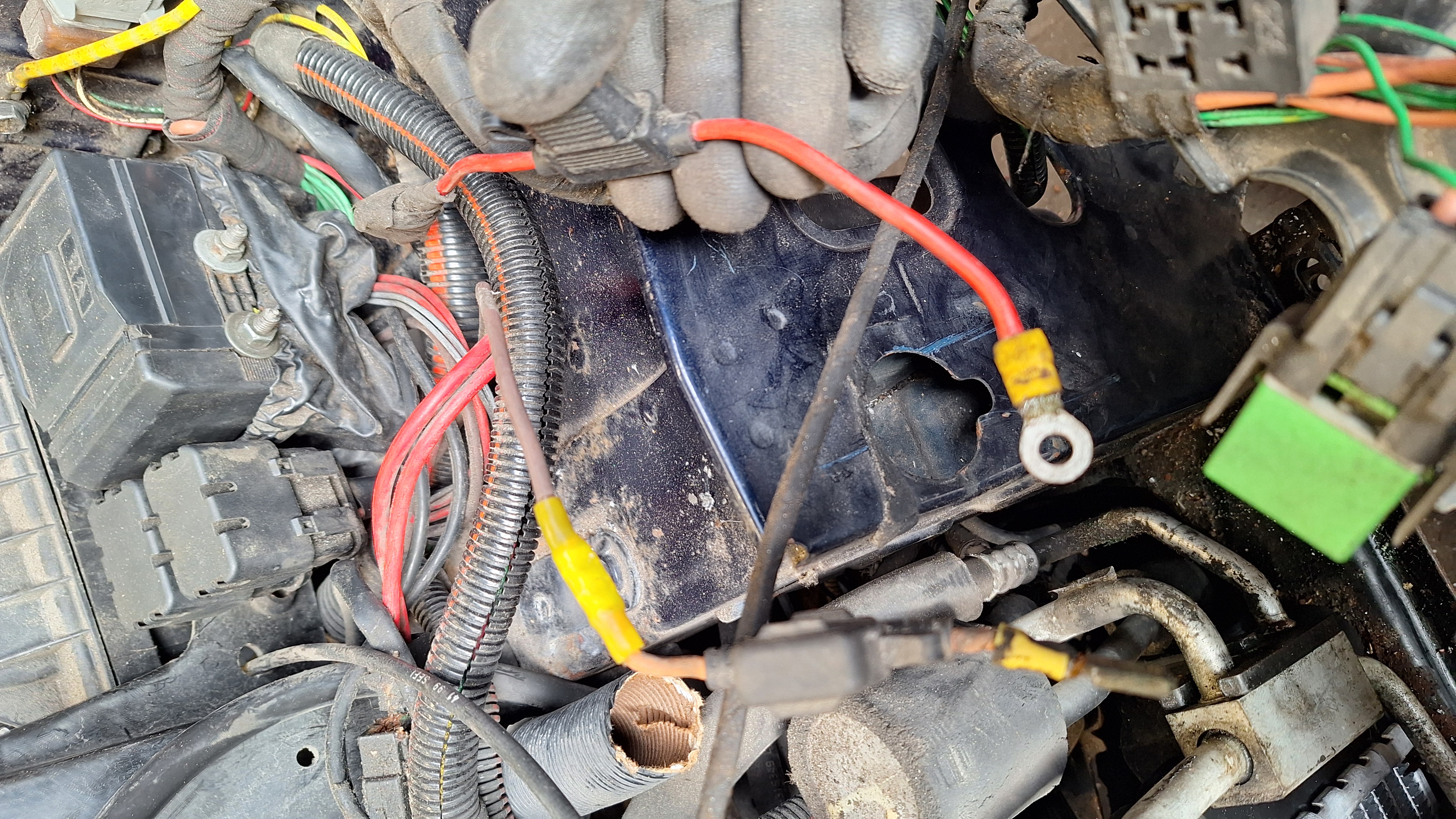Die losse oogjes met zekering eraan kan niet anders dan loodrecht op de plus van de accu. Zal wel de zekering-modificatie voor de kachel zijn.