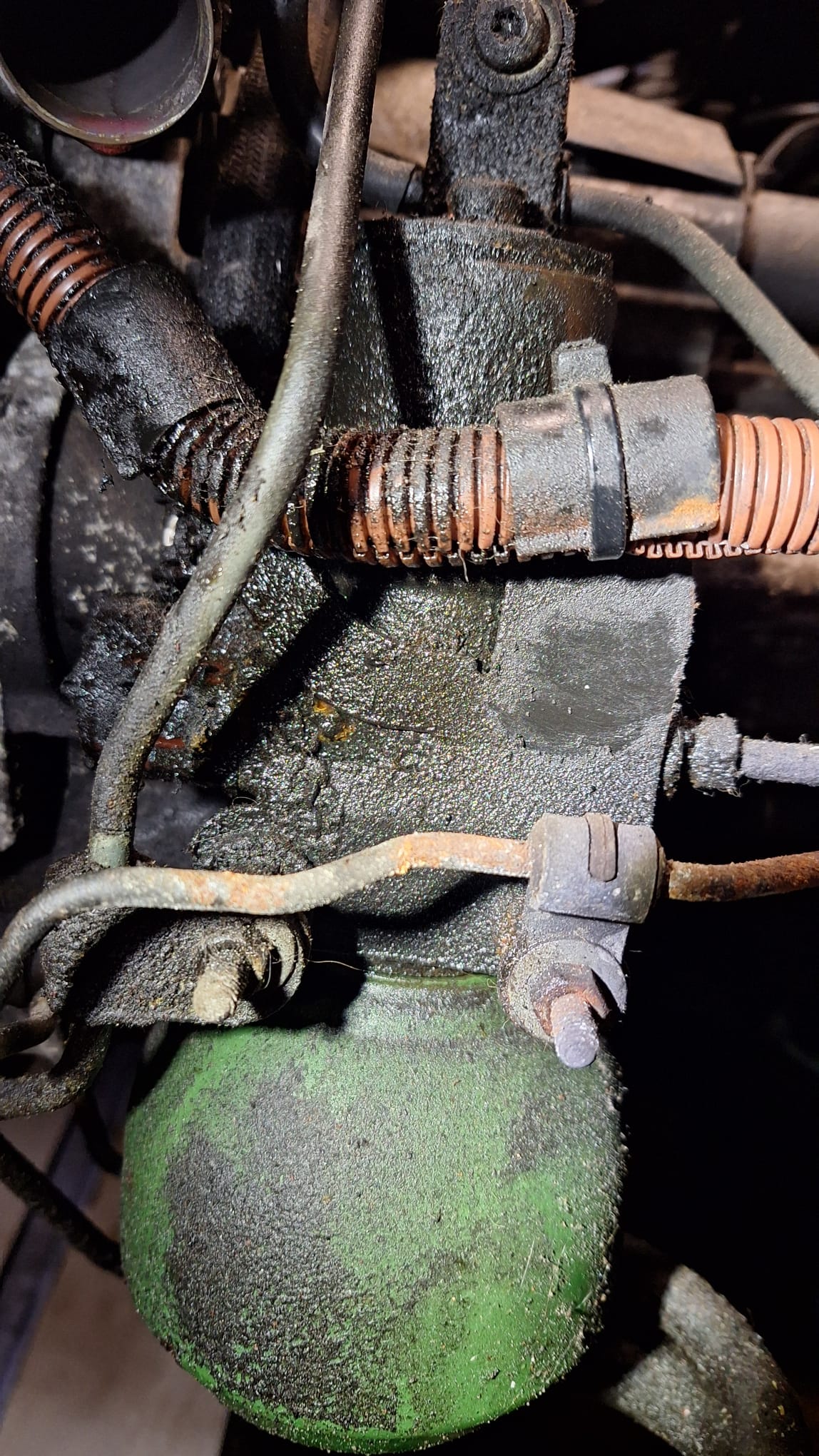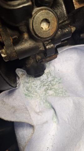 Als je plunjer afdichtingen lekken, of het koppelstuk van de aanzuigbuis, dan loopt de lekkage meestal meer over het middenvlak van de pomp en via de punt van de AC-pomp die wel vrij boevn de grond hangt. De LHM loopt dan ook meer langs de dynamo dan er in.