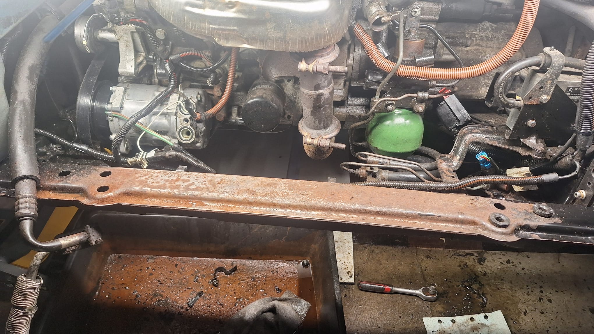 Zoja.., voel eens langs de binnenrand van het subframe naar voren toe. Over die rand loopt namelijk de LHM omlaag die ter hoogte van de pulleyzijde-afdichting omlaag lekt. (Ook deels die zijdes van de pomp en AC-pomp. Daarvan hangt de buitenpunt dus net boven die rand. Vandaar dat het dan niet onder de pompen op de grond lekt.)