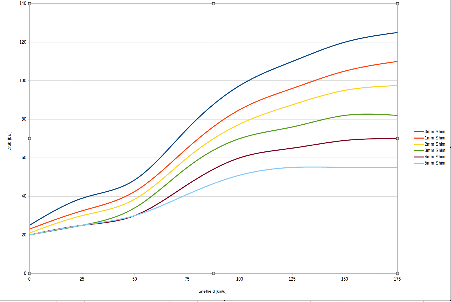 Met de enkel de kabel losgenomen en de standaard shimming was de basisdruk een constante 24bar. Door extra shims toe te voegen wordt deze druk naar 20bar verlaagt. Dat klinkt niet als veel verschil, maar blijkbaar wordt de druk zodanig laag dat deze het stuur niet meer weet te centreren op hogere snelheid. (Tenzij dus een verdere uitslag. Dat geeft mechanisch een hogere tegendruk, waardoor het daar wel nog functioneert. Waarschijnlijk zal dit probleem trouwens te 'tackelen' zijn door de demping van middenstand-regeling op de Diravi zelf nog strakker af te stellen. Hoewel het best zou kunnen dat daar ook gewoon een grens aan zit die hier niet voor compenseert.)